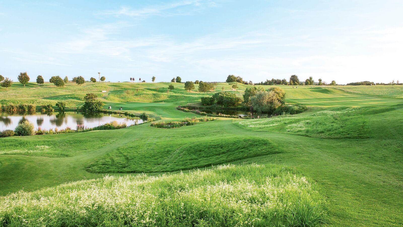 The English golf course architect Jeremy Pern has embedded a championship course in this idyllic landscape of orchards and fields in the early 90s. No train is like another. A steady wind provides for changing conditions and cooling in the hot summer, drought in the wet autumn or winter.